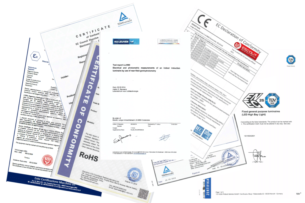 Alle Escolit verlichtingsarmaturen werden uitgebreid getest op vlak van functionaliteit, duurzaamheid, technische performantie en conformiteit. We hebben dan ook alle benodigde Europese certificaten, wat ons toelaat om op alle producten 5 jaar volledige Europese garantie te geven.  Steeds meer armaturen uit ons gamma zijn ENEC-gecertifieerd.