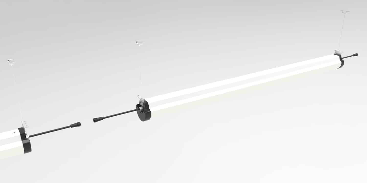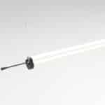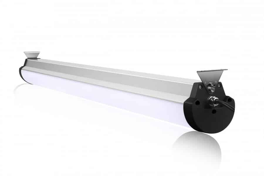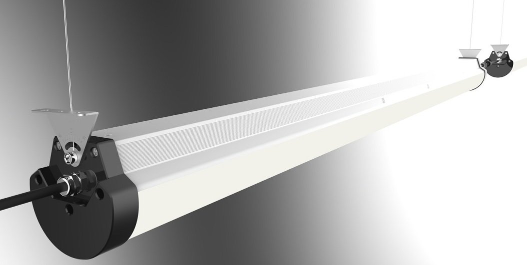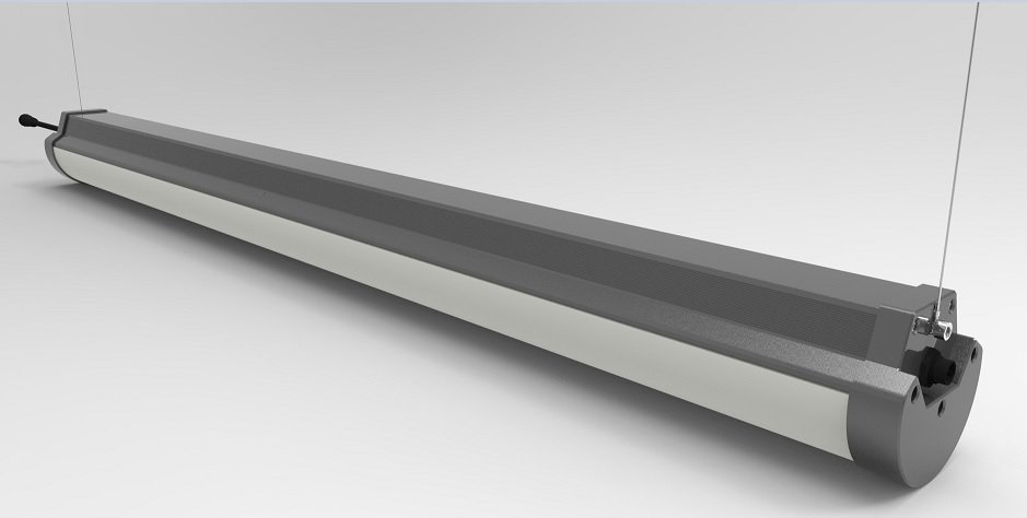 LED langwerpige armatuur met diffuser-kap, IP66 en slagvastheid IK10, met stralingshoek 140°, Samsung SMD LED’s en Meanwell driver. Behuizing standaard donkergrijs gelakt aluminium met PMMA diffuser kap. Geïntegreerde driver, mogelijkheid tot onderling doorverbinding van de armaturen. Roteerbare (+/-45°) montagebeugel of gependeld met kabels met aanpasbare hoogte (inclusief).