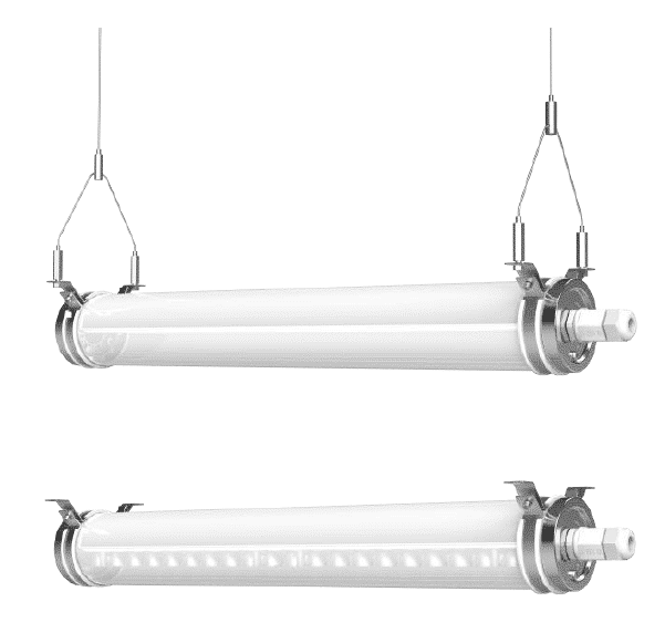 Ophangsysteem met harde Y-vorm kabel voor perfecte balans. De armaturen kunnen in lijn opgesteld worden dankzij een quick fit verbindingssysteem. De eindkappen zijn standaard in 316 grade RVS (roestvrij staal), de ophangkabels 304 grade RVS. Montage in opbouw of pendel, stroomdoorvoer connectie mogelijk. Standaard versie met 140 lm/W efficiëntie (low glare versie 130 lm/W).
