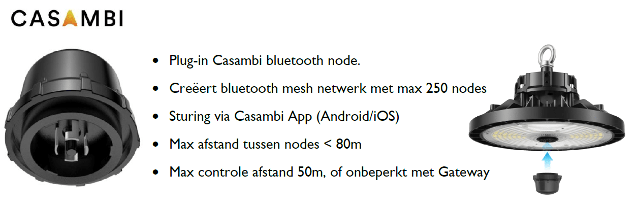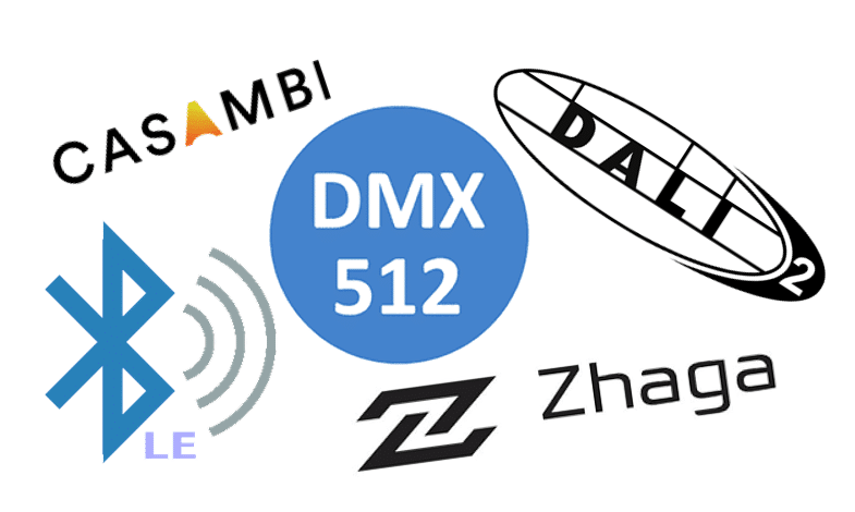 Verder zijn er de WIFi en Bluetooth mesh protocols waar de Escolit armaturen kunnen in geïntegreerd worden, of in bepaalde gevallen uitgerust worden mits een plug-in node om bijvoorbeeld te werken binnen een Casambi gestuurd netwerk, zoals de EH1-serie.