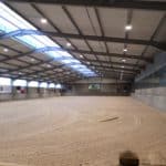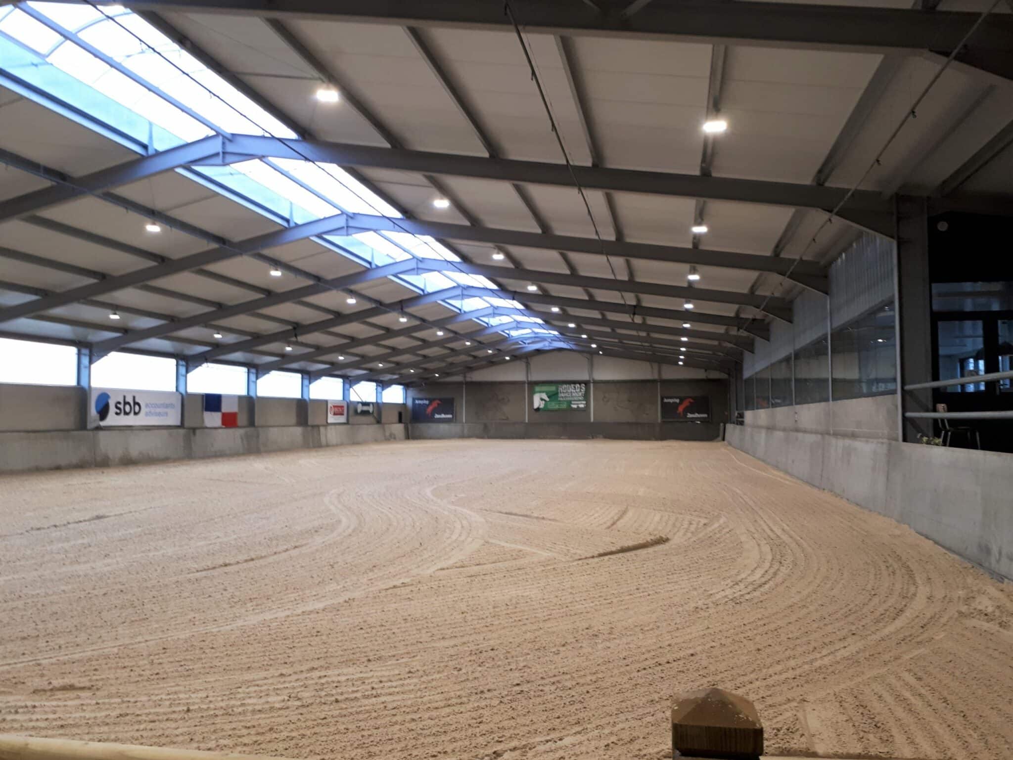 Relighting van de binnenpiste van een manège met speciale aandacht voor de lage verblinding en uniforme lichtsterkte op de hoefslag. Uitgewerkt met EH1-serie klokarmaturen.