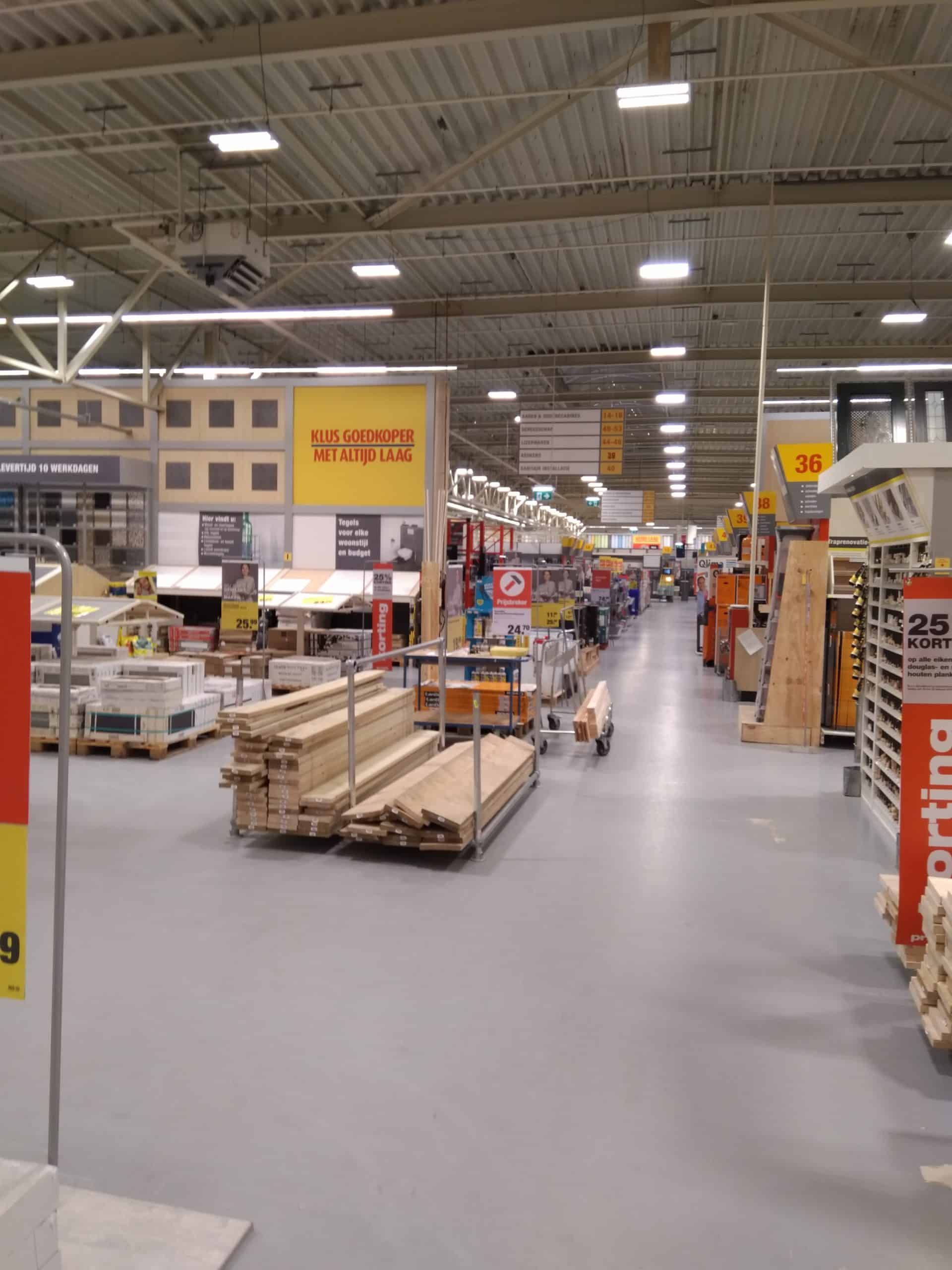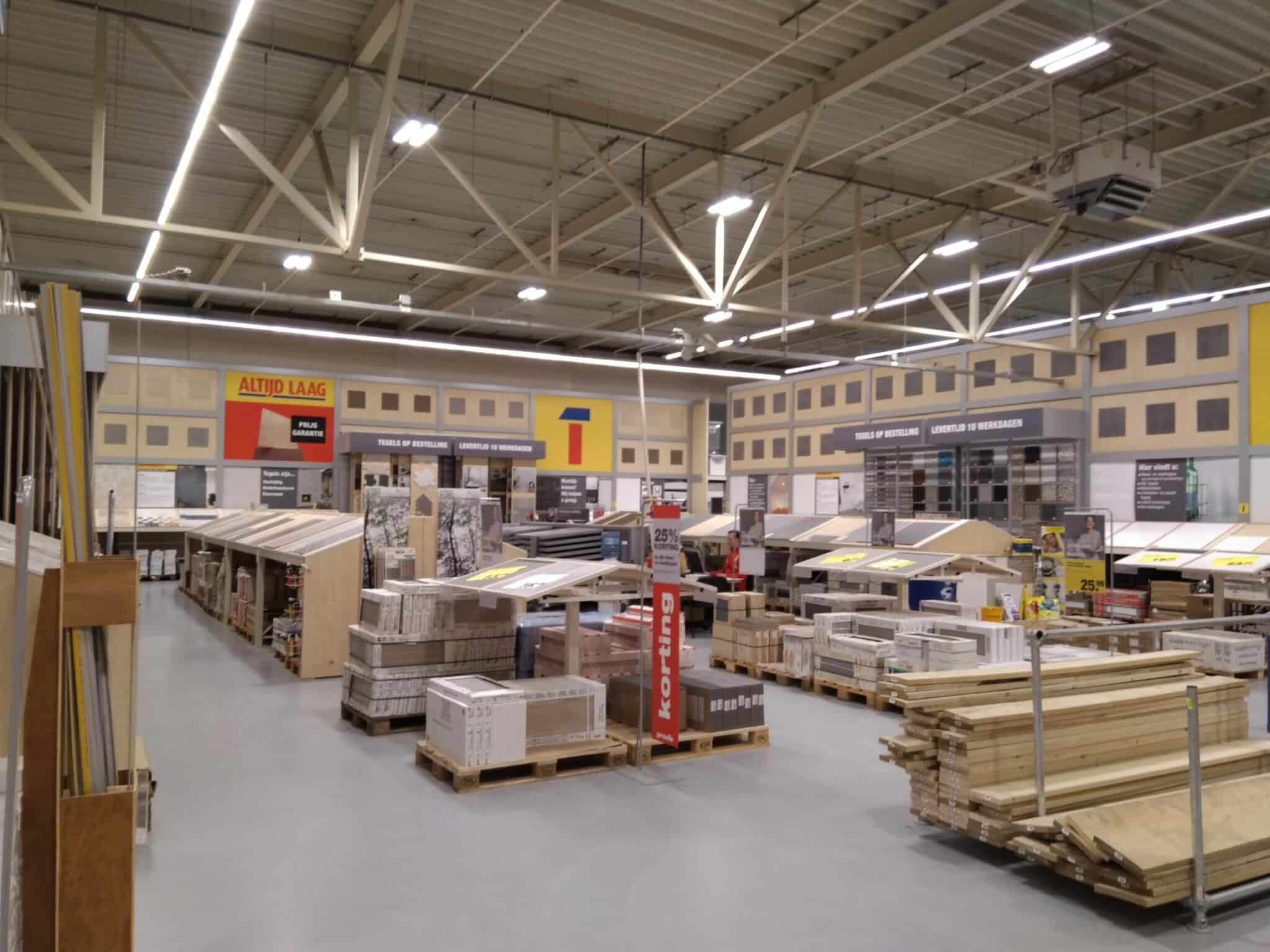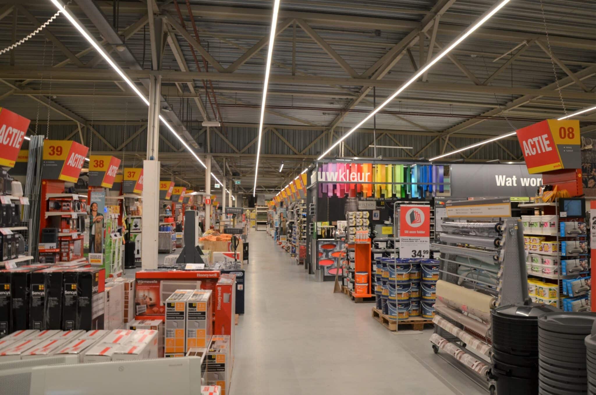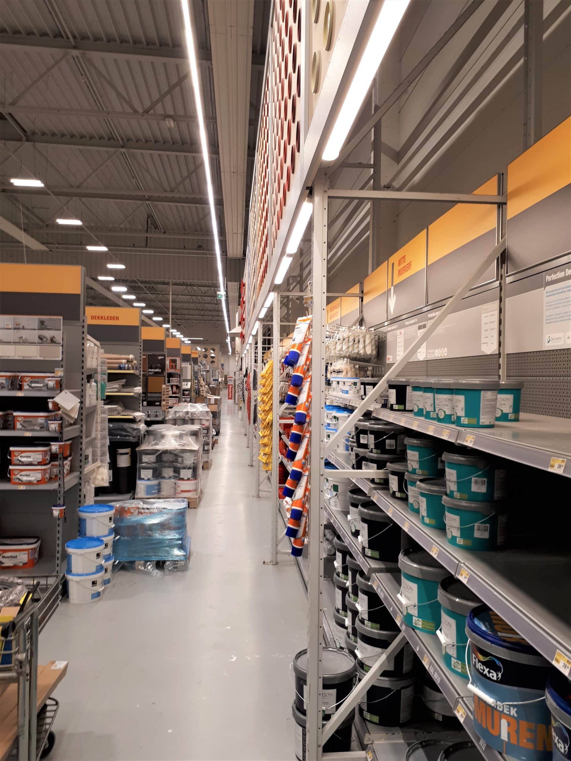 Totale relighting (LAAS) van Praxis winkels in Nederland, toegepaste armatuur-series hoofdzakelijk EM5-serie in combinatie met ELL1-serie en EBR-serie.