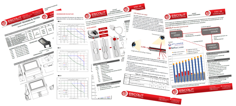 Escolit’s uitgebreide catalogus van technische folders omvatten vele aspecten: technische specificaties van de lichttechnologieën, informatie over dimmen, over lichttechnische aspecten zoals kleurweergave-index of S/P ratio, montagehandleidingen en testrapporten.