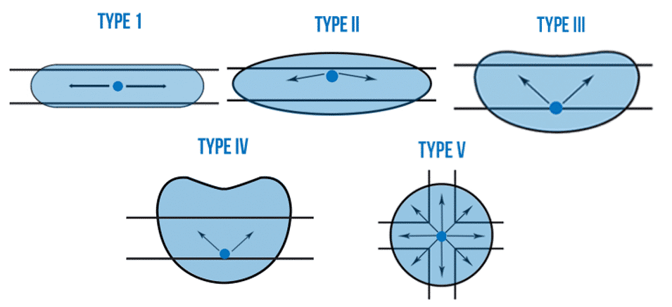 - Type V: lichtstraling in een circulair patroon rondom het armatuur. geschikt voor algemene zone verlichting of parkings.